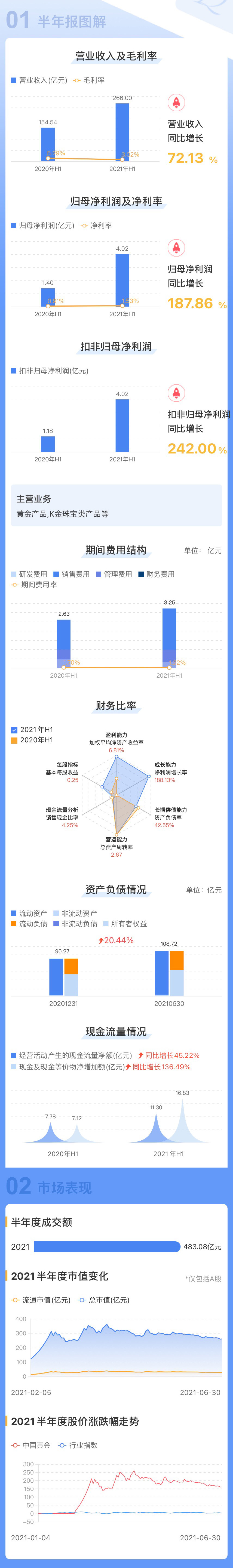 中國黃金集團黃金珠寶股份有限公司(簡稱“中國黃金”600916.SH)于今日發布2021年半年度業績公告,業績大幅增長188%