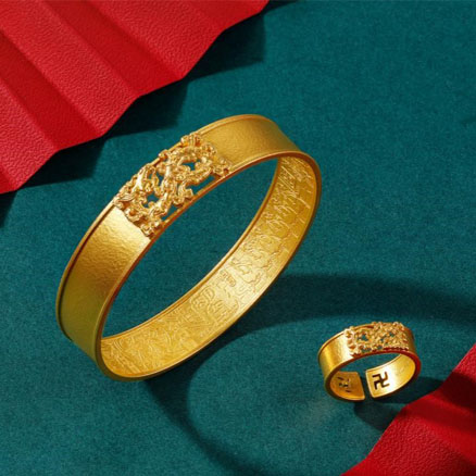 該套產(chǎn)品以武則天的人生經(jīng)歷為原型,向歷史中的女神致敬,展現(xiàn)新時代女性獨立、自主、勇敢、智慧的美好主張。 首飾采用手工鏨刻錘碟紋,并嵌鏤空如意祥云形龍紋浮雕,寓意龍佑吉祥,彰顯權利和尊貴。手鐲內(nèi)側鑄刻武則天生平畫,描寫了武則天從出生、入宮、稱帝、創(chuàng)字、萬國來朝的人生軌跡及武則天自創(chuàng)的名字“曌”字(寓意日月當空)。戒口兩邊鏤空萬字紋,寓意萬吉萬福齊聚,內(nèi)部鑄刻“女王稱帝”圖。吊墜呈長方形,上刻武則天自創(chuàng)名字“曌”字,下鈐武則天的“則天大圣皇帝”隸書璽印問,精致而古樸,體現(xiàn)了一代巾幗天驕的威嚴。